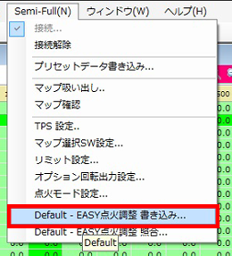 2.必要な修正が終わりましたら、上部メニュー「Semi-Full」→「EASY点火調整書き込み」を選択し、書き込みを行います。